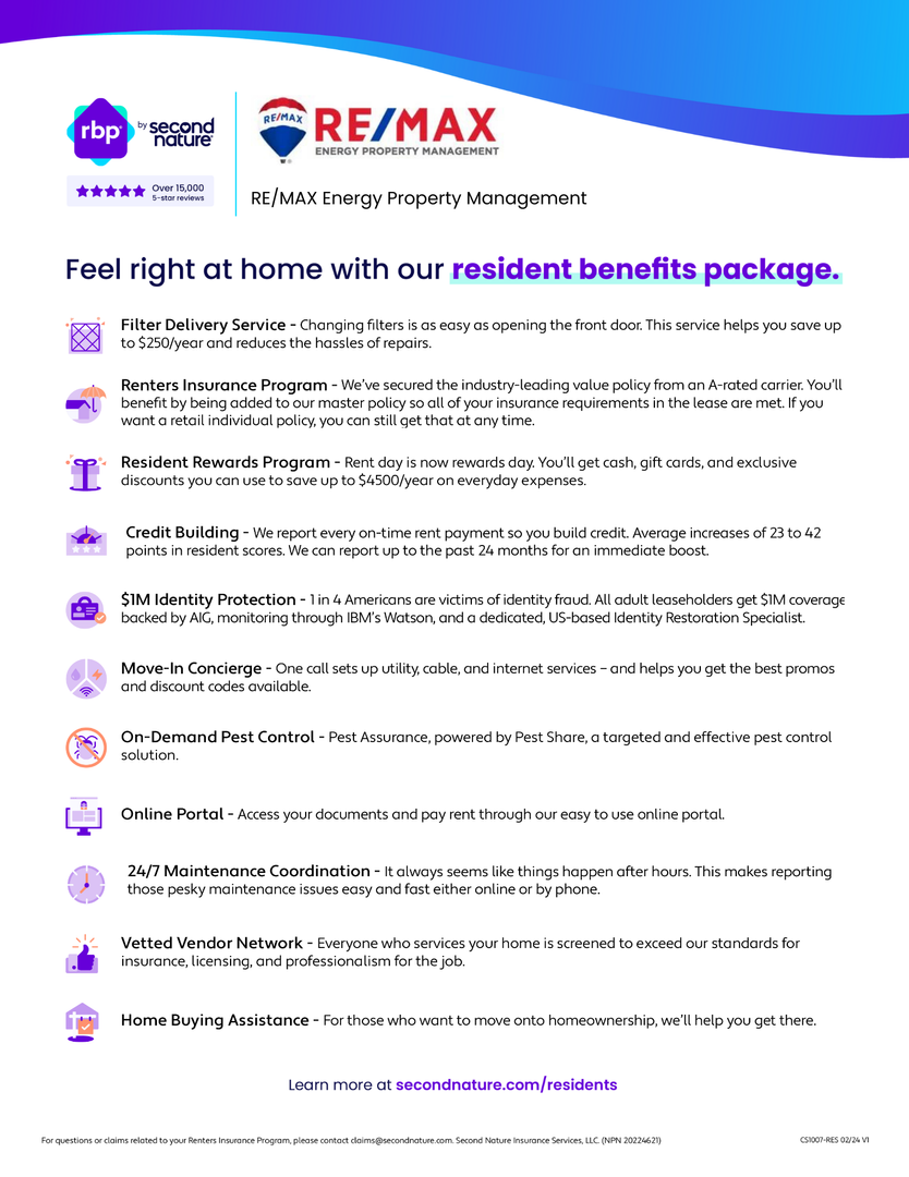All First Class Property Solutions residents are enrolled in the Resident Benefits Package (RBP) for $50.00/month which includes liability insurance, credit building to help boost the resident’s credit score with timely rent payments, up to $1M Identity Theft Protection, HVAC air filter delivery (for applicable properties), move-in concierge service making utility connection and home service setup a breeze during your move-in, our best-in-class resident rewards program, on-demand pest control, and much more! More details upon application.